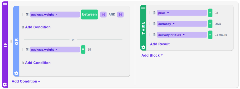 Every rule starts with the IF statement (block) where you define the condition you want to set. In our case the condition will be package.weight where we will set the value between 0 and 9. On the other side of the block, you can add multiple conditions to create branches, but we chose a THEN statement, which determines what will be the output (result) when the IF condition is matching the input. The results are price, currency and deliveryInHours.