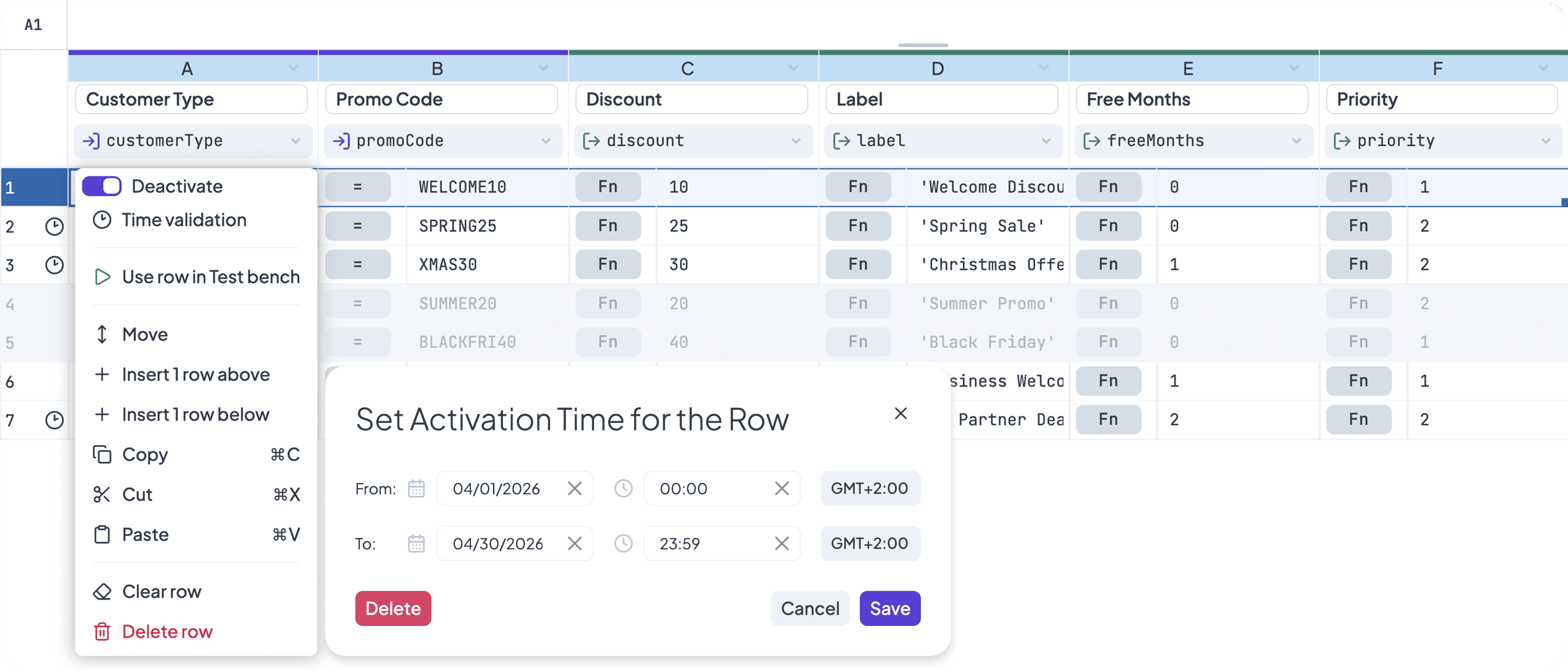 - Set time-based validity on any row