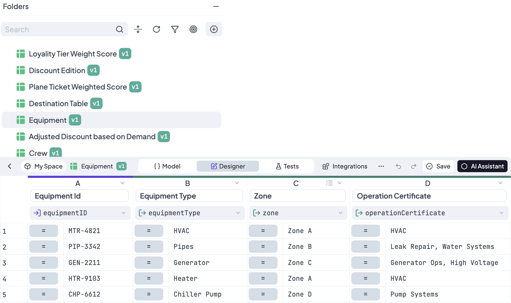 "Describe your logic in plain language and the AI Assistant builds the table. Generate test data, write functions, summarize any rule. From idea to working logic in seconds.