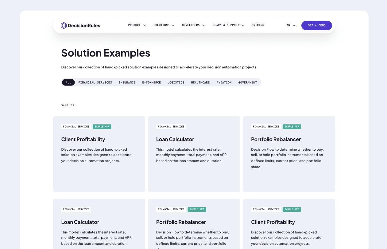 - Live, interactive demos built on real DecisionRules rules
