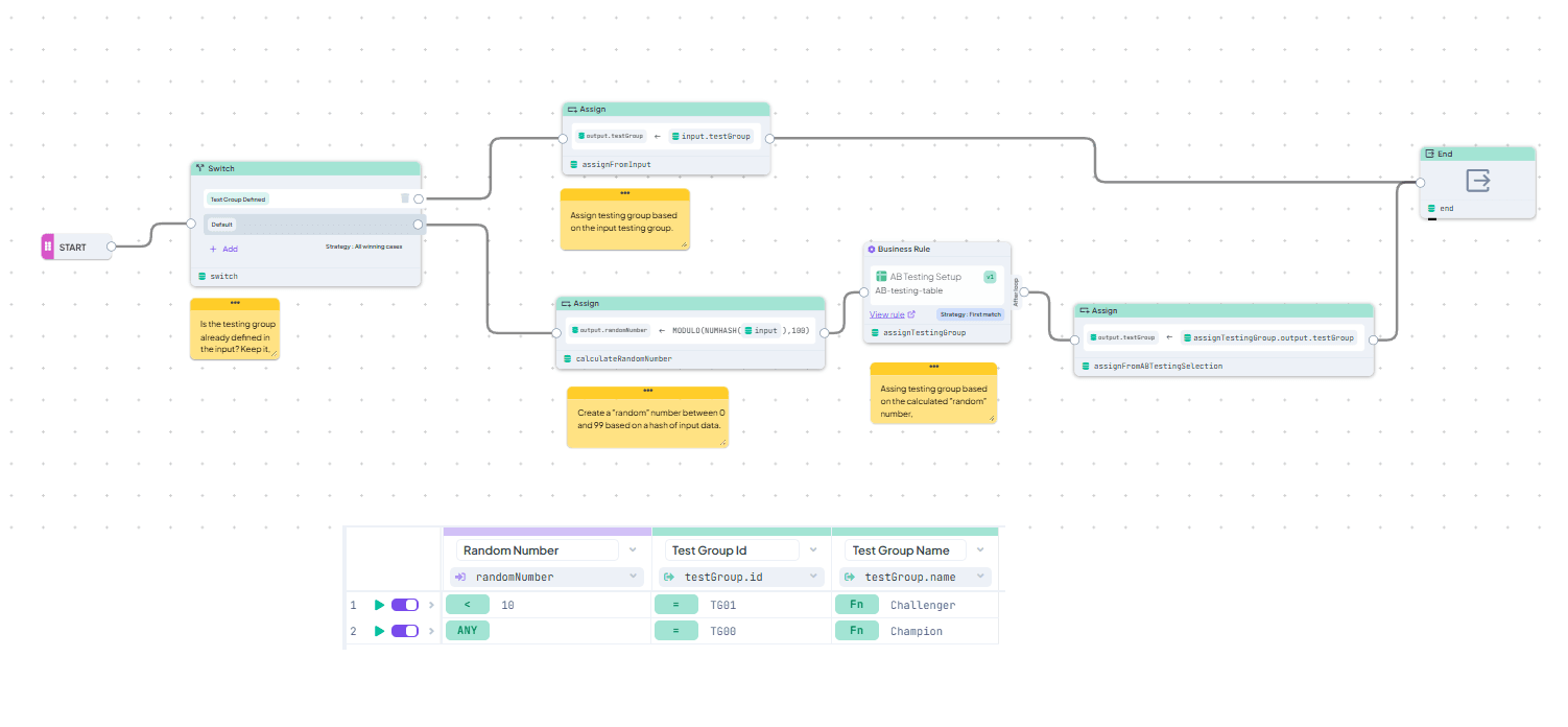 - a Decision Flow checks, whether the testing group is already known - if not, it calculates a pseudo-random number based on the inputs (to ensure for the same inputs the same testing group is used), executes the Decision Table assigning the testing group and assigns its output to the Decision Flow output.