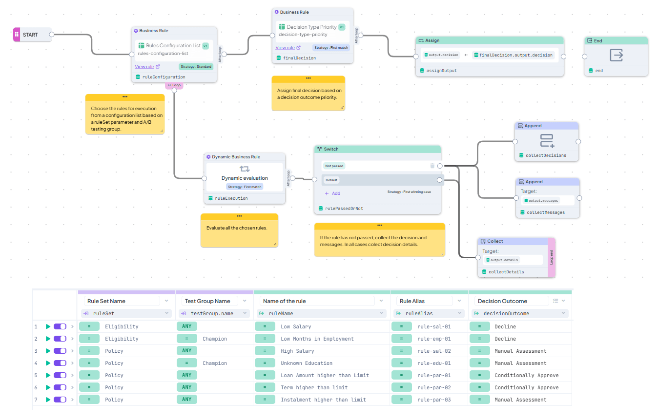 This Decision Flow dynamically executes a specified set of rules defined by a Decision Table and evaluates the final outcome of the decision (Decline, Manual Approval, ...) based on defined priorities. Typical usage shown in this example are Eligibility and Policy rules evaluated during a loan approval process.