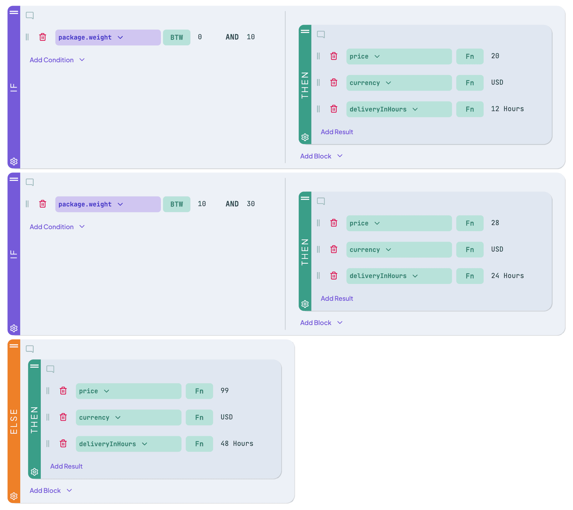 - Output logic determines three distinct outputs: Price (the calculated cost of shipping, defined as price), Currency (the monetary unit, fixed as USD in this version, defined as currency), and Delivery Duration (the estimated time for arrival, defined as deliveryInHours).