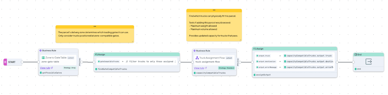 - a Decision Flow named Single Parcel Handler orchestrates all rules: First, it identifies eligible gates for the delivery zone, filters trucks by gate compatibility, validates capacity constraints, selects the best available truck based on departure schedule, and finally returns the assignment with updated truck capacity.