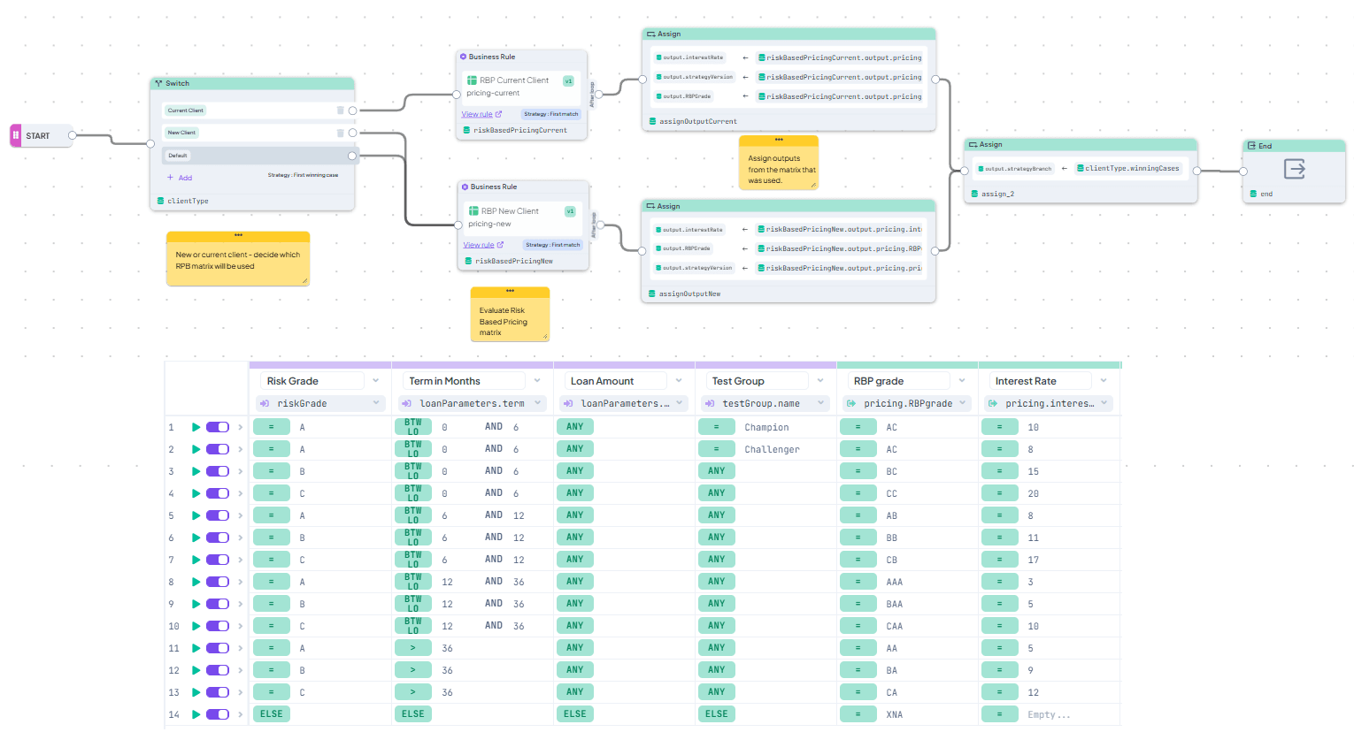 - Decision Tables for new clients (RBP New Client) and current clients (RBP Current Client) which calculate pricing grade and interest rate based on risk grade, loan term and loan amount, allowing for a special setup for different A/B testing groups.
