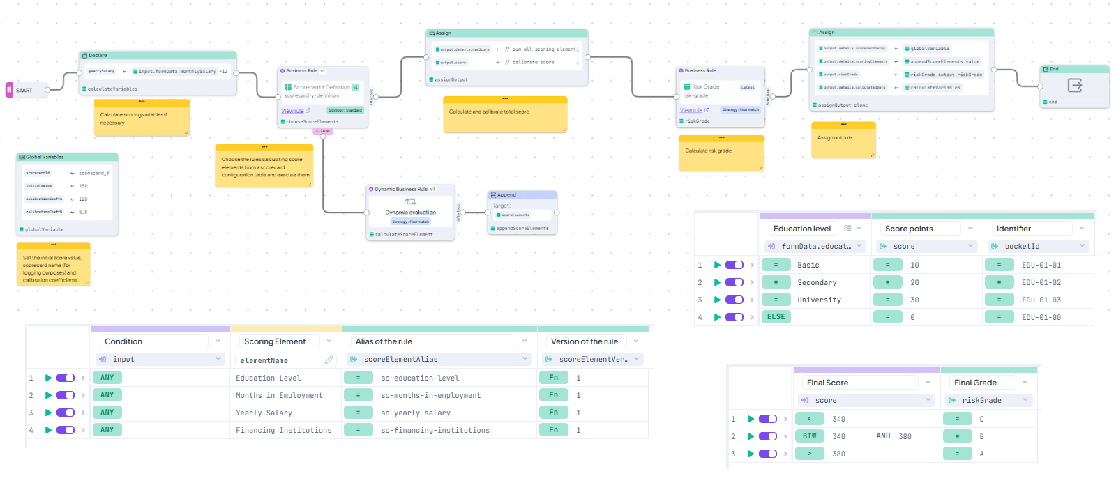 • a Decision Flow orchestrates the calculation: sets scorecard coefficients, calculates scoring variables when necessary, executes the Scorecard Definition table to get the list of scoring rules, executes them, calculates the total score, calibrates it and derives the risk grade using the Risk Grade table.